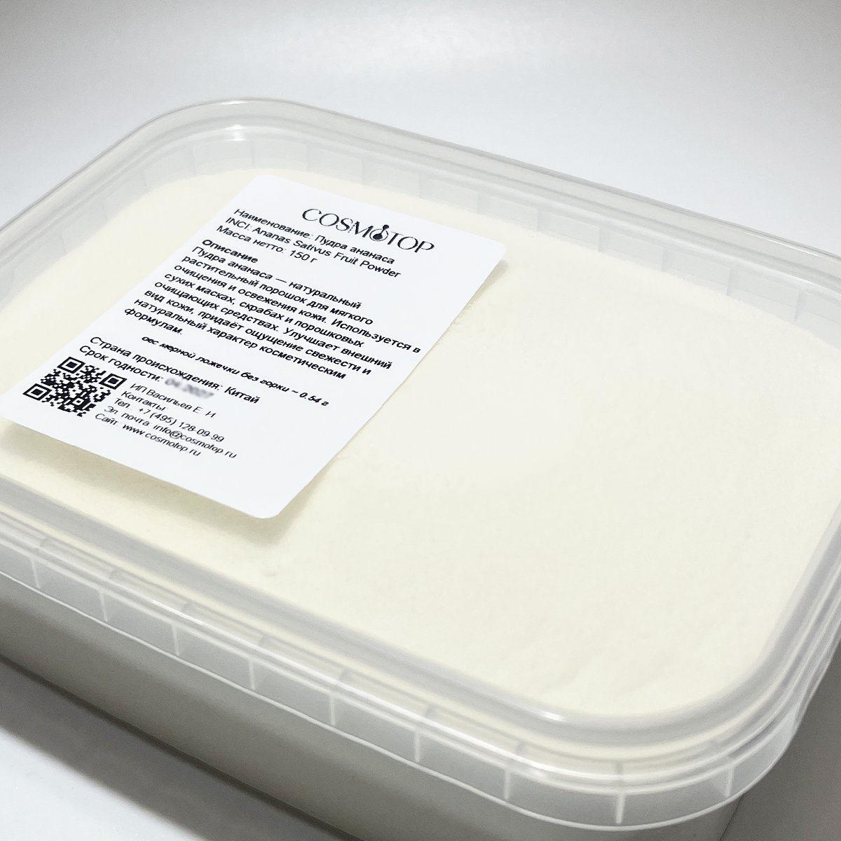 Пудра ананаса — натуральный порошок растительного происхождения, получаемый из плодов ананаса. Используется в косметике как мягкий очищающий, освежающий и вспомогательный эксфолиирующий компонент. Содержит природные сахара, органические кислоты и следы ферментов, способствующие улучшению внешнего вида кожи. Применяется в сухих масках, скрабах, порошковых очищающих средствах и SPA-продуктах. Придаёт формулам натуральный характер и мягкое тонизирующее действие.