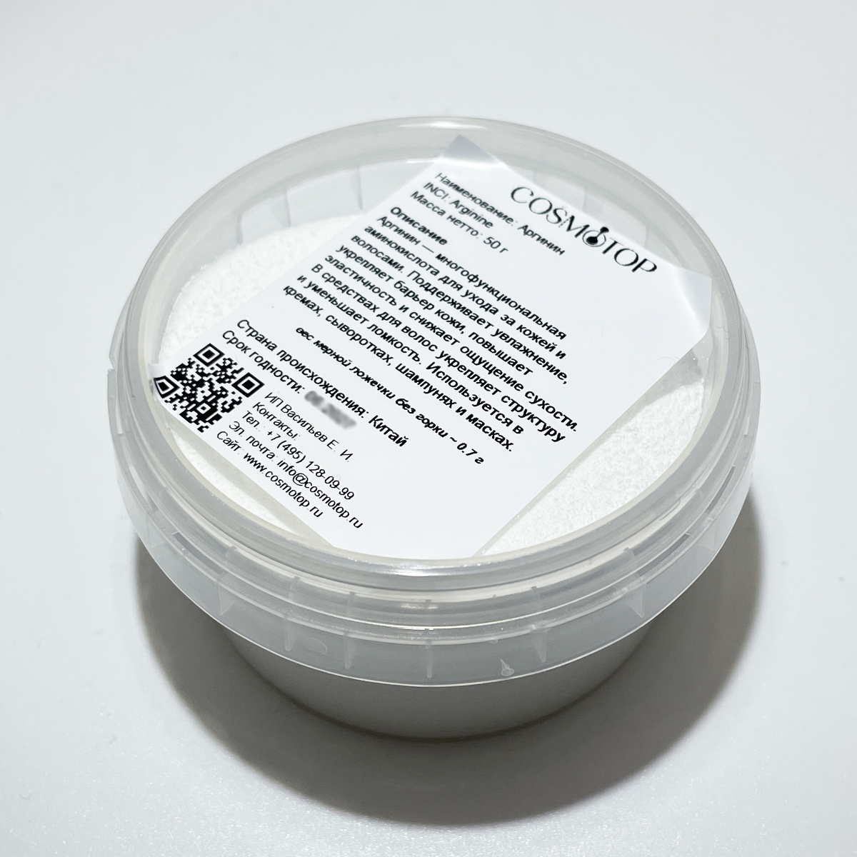 Аргинин (Arginine) — аминокислота, естественно присутствующая в коже и волосах. В косметике используется как увлажняющий, кондиционирующий и восстанавливающий компонент. Участвует в поддержании барьерных функций кожи, улучшает микроциркуляцию и способствует восстановлению повреждённых тканей. В средствах для волос укрепляет структуру, повышает эластичность и снижает ломкость. Также применяется как мягкий регулятор pH в водных формулах. Используется в кремах, сыворотках, шампунях, масках и средствах для чувствительной кожи.