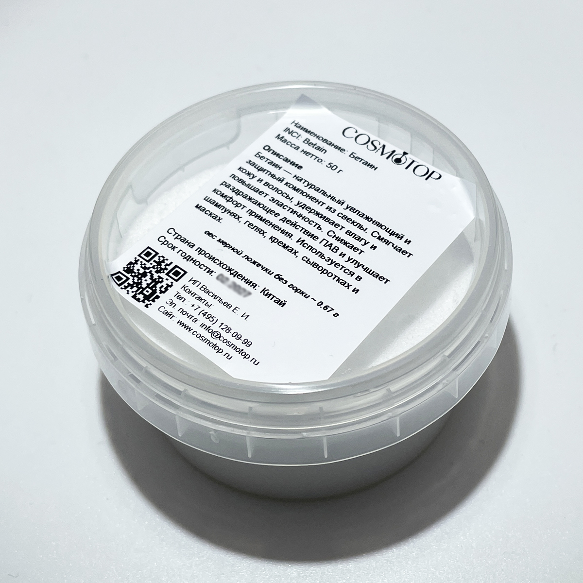 Бетаин (Betaine, Trimethylglycine) — натуральный осмолит, аминокислотоподобное соединение, получаемое из свеклы. Обладает выраженными увлажняющими, смягчающими и антистатическими свойствами. В косметике используется как активный увлажнитель, кондиционирующий и защитный компонент. Снижает раздражающее действие ПАВ, улучшает сенсорные свойства средств и делает кожу и волосы более мягкими и гладкими. Применяется в шампунях, гелях, кремах, сыворотках и масках.