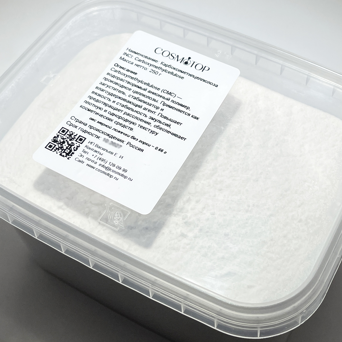 Карбоксиметилцеллюлоза (Carboxymethylcellulose, CMC) — водорастворимый анионный полимер, производное натуральной целлюлозы. Используется в косметике и фармацевтике как загуститель, стабилизатор и влагоудерживающий агент. Улучшает вязкость и структуру эмульсий, повышает стабильность суспензий и гелей. Обеспечивает однородность текстуры, уменьшает расслаивание и улучшает сенсорные свойства. Применяется в шампунях, гелях, кремах, зубных пастах и других средствах.