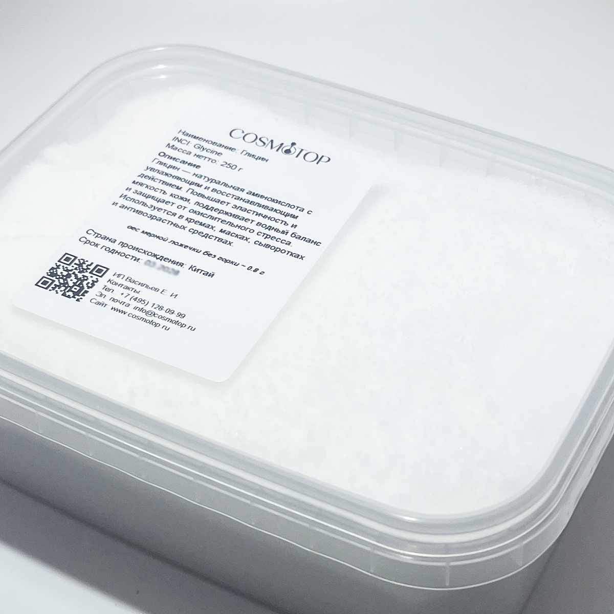 Глицин (Glycine) — самая простая аминокислота, встречающаяся во всех белках организма. В косметике используется как увлажняющий, антиоксидантный и успокаивающий компонент. Улучшает гидратацию кожи, способствует восстановлению клеток и защищает их от окислительного стресса. Обладает мягким кондиционирующим действием, делает кожу и волосы гладкими и эластичными. Применяется в кремах, масках, сыворотках, шампунях, антивозрастных и восстанавливающих формулах.