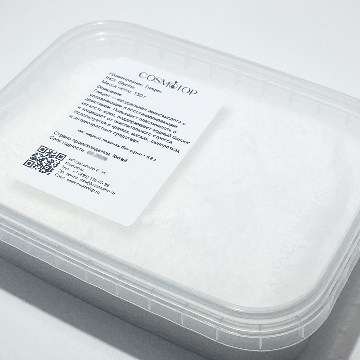 Глицин (Glycine) — самая простая аминокислота, встречающаяся во всех белках организма. В косметике используется как увлажняющий, антиоксидантный и успокаивающий компонент. Улучшает гидратацию кожи, способствует восстановлению клеток и защищает их от окислительного стресса. Обладает мягким кондиционирующим действием, делает кожу и волосы гладкими и эластичными. Применяется в кремах, масках, сыворотках, шампунях, антивозрастных и восстанавливающих формулах.