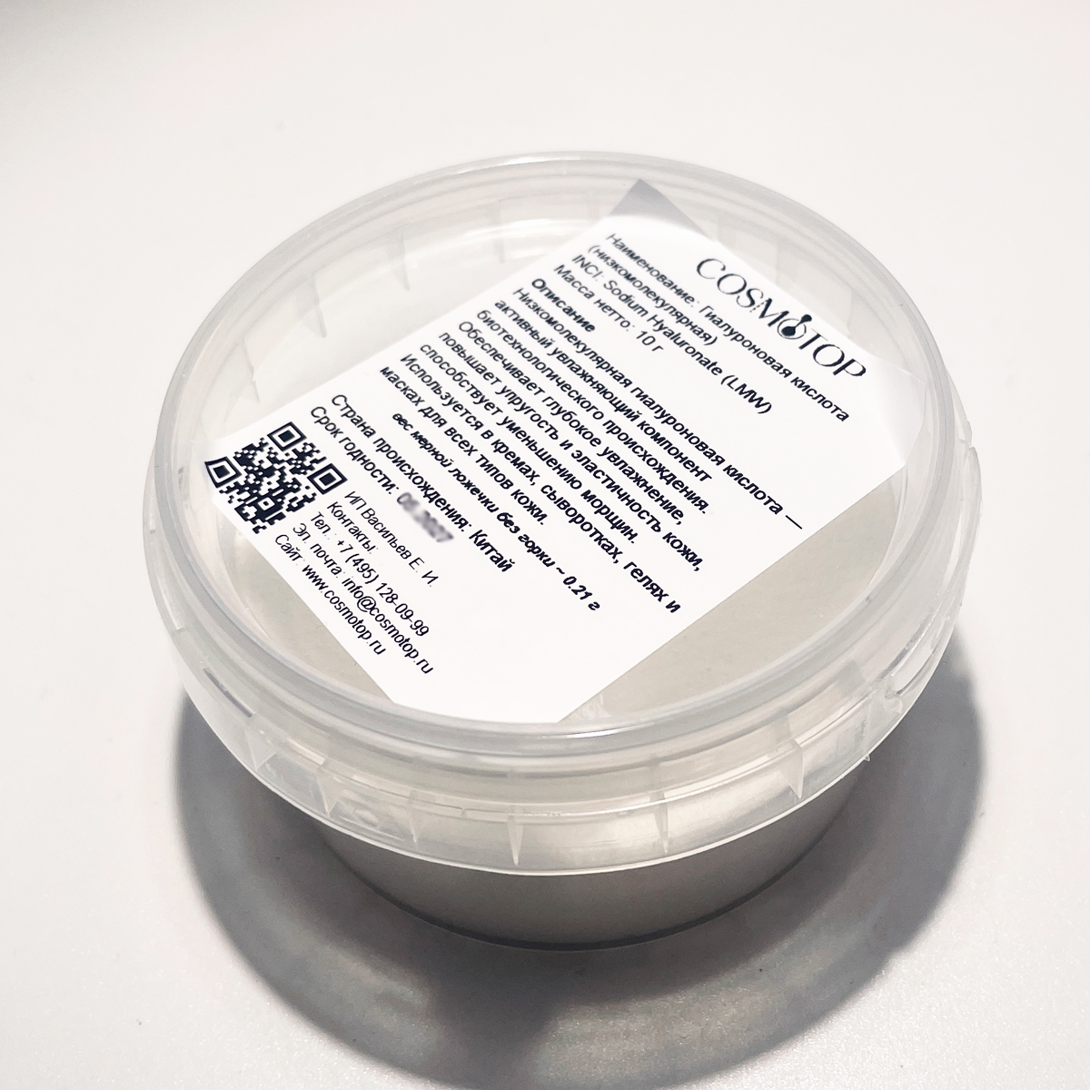 Гиалуроновая кислота низкомолекулярная (Low Molecular Weight Hyaluronic Acid, LMW HA) — биополимер, получаемый биотехнологическим путём ферментации. Благодаря малому размеру молекул проникает глубже в роговой слой кожи, обеспечивает длительное увлажнение, улучшает эластичность и упругость кожи изнутри. Используется в сыворотках, кремах, гелях и масках как активный увлажняющий компонент. Совместима с большинством косметических ингредиентов и подходит для всех типов кожи, включая чувствительную.
